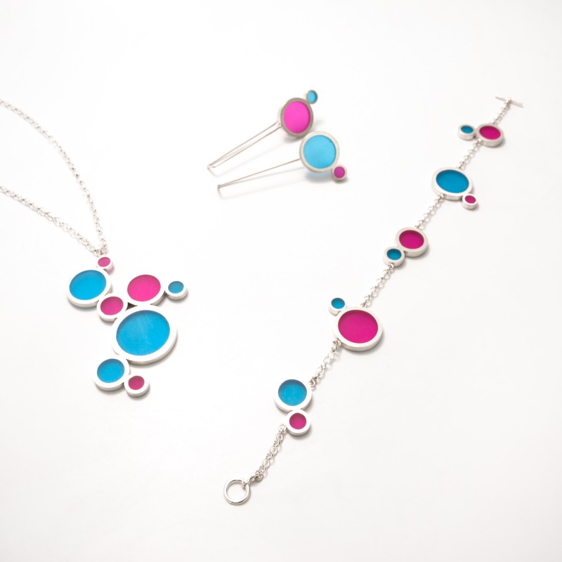 The colourful bubbles of this collection have been one of my most popular designs from the start. The idea was older than my jewellery making, first executed in the actual materials for an exhibition in 2010. The first colour combination used was green with purple, the orange with blue was added a year later for a London trade show. Now after more than 2 years a third colour combination arrives! Say hello to pink & ice blue. How do you like them?